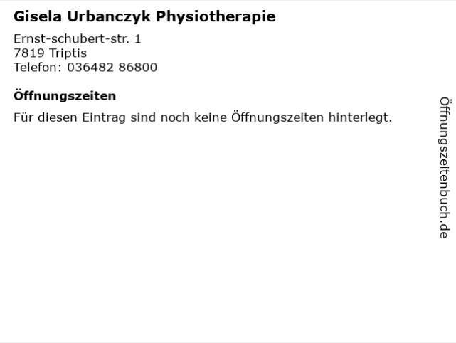 Die Praxis von Gisela Urbanczyk Physiotherapie befindet sich an der Ernst-Schubert-Straße 1, 07819 Triptis. Die Kontaktdaten lauten Telefon: 03648286800 und E-Mail: [email protected].